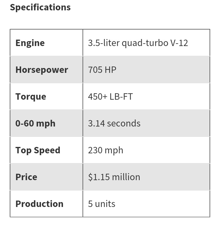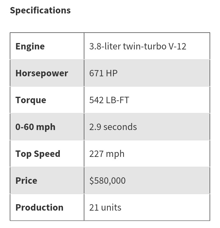 B Engineering Edonis is one of the more obscure vehicles on the list. It’s based on the Bugatti EB110 Super Sport from the 1990s but with a heavily-redesigned exterior and interior. The carbon-fiber chassis was a complete carry-over from the EB110 SS, but the engine and drivetrain were reworked. Bugatti’s 3.5-liter V-12 grew to 3.8 liters and the quad-turbo setup was slapped for a twin-turbos.